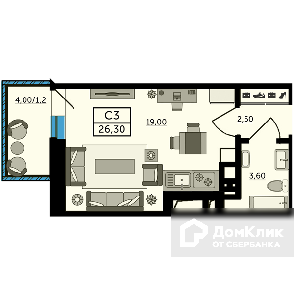 - Общая площадь: 26.4 м²