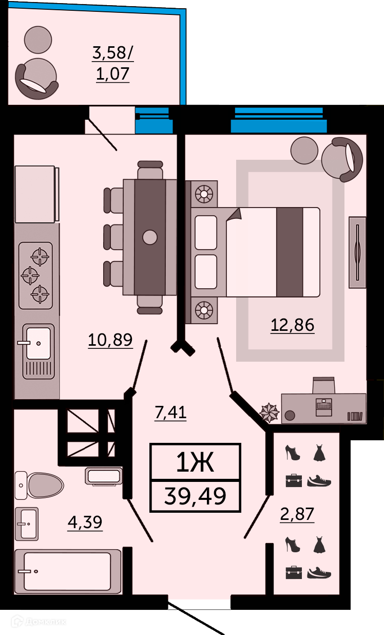 - Общая площадь: 39.6 м²