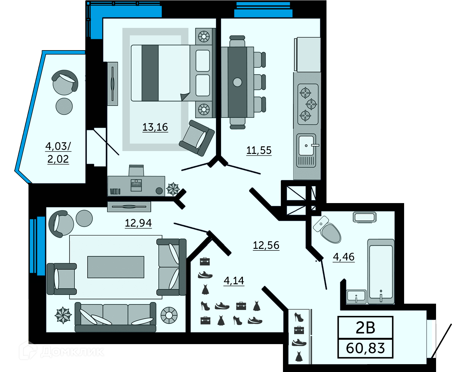 - ✅ Кухня: 11.55 м² — эргономичное пространство.