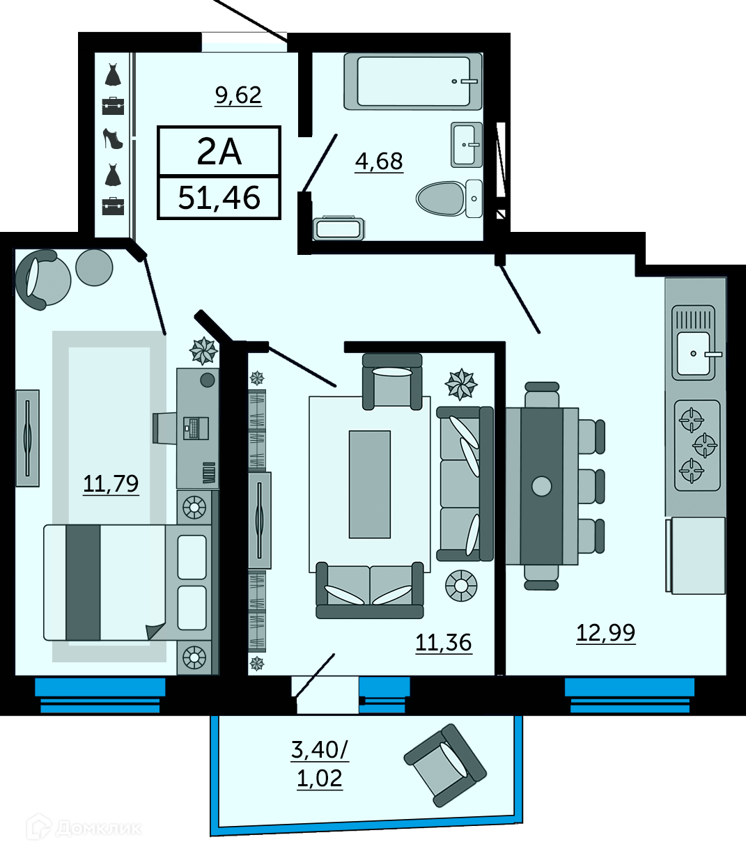 - Общая площадь: 51.7 м²