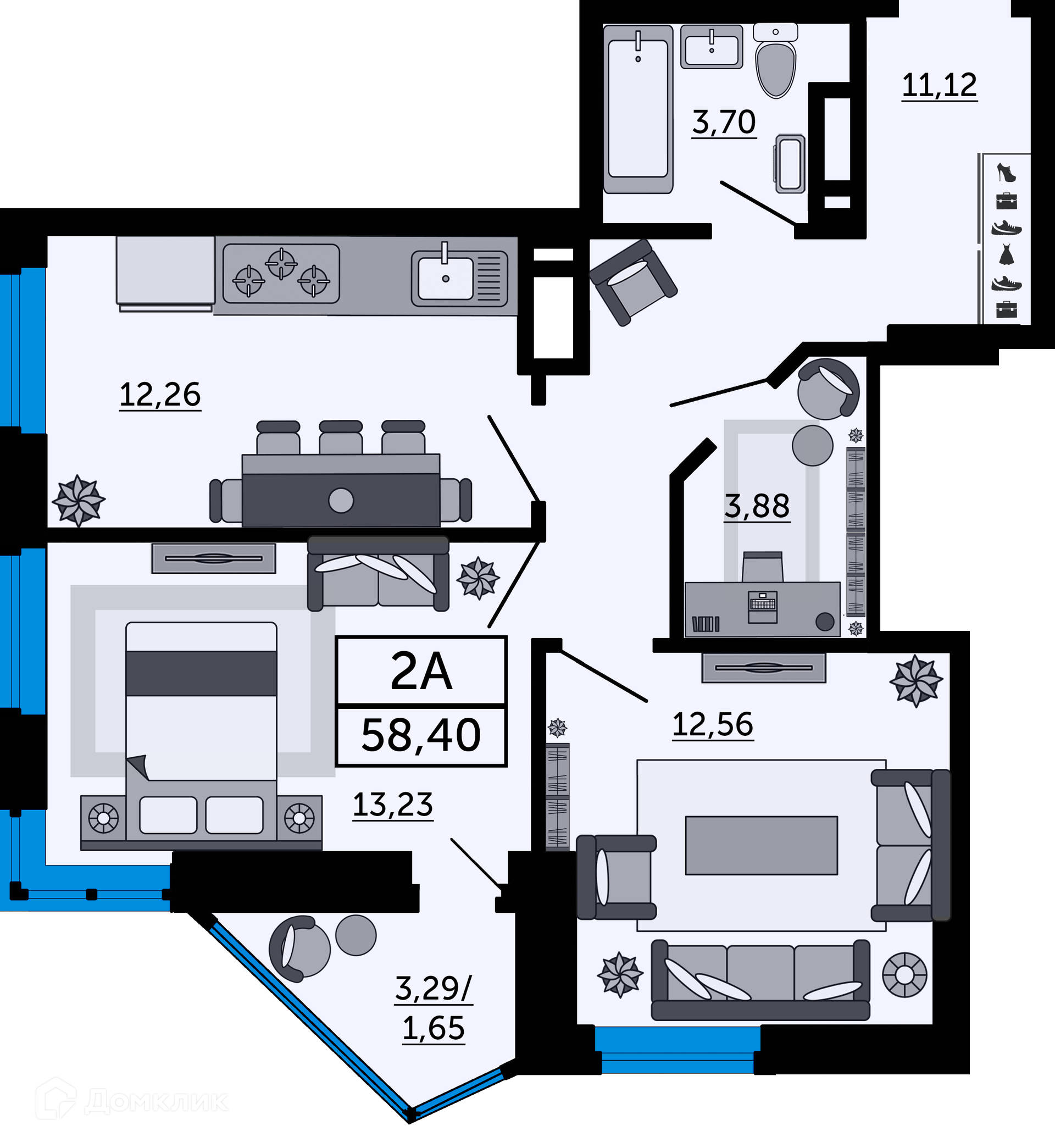 - ✅ Общая площадь: 58.4 м².