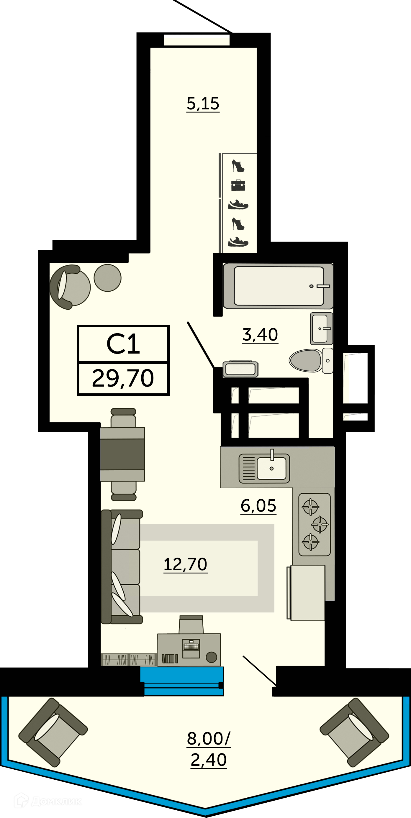 - ✅ Общая площадь: 29.7 м².