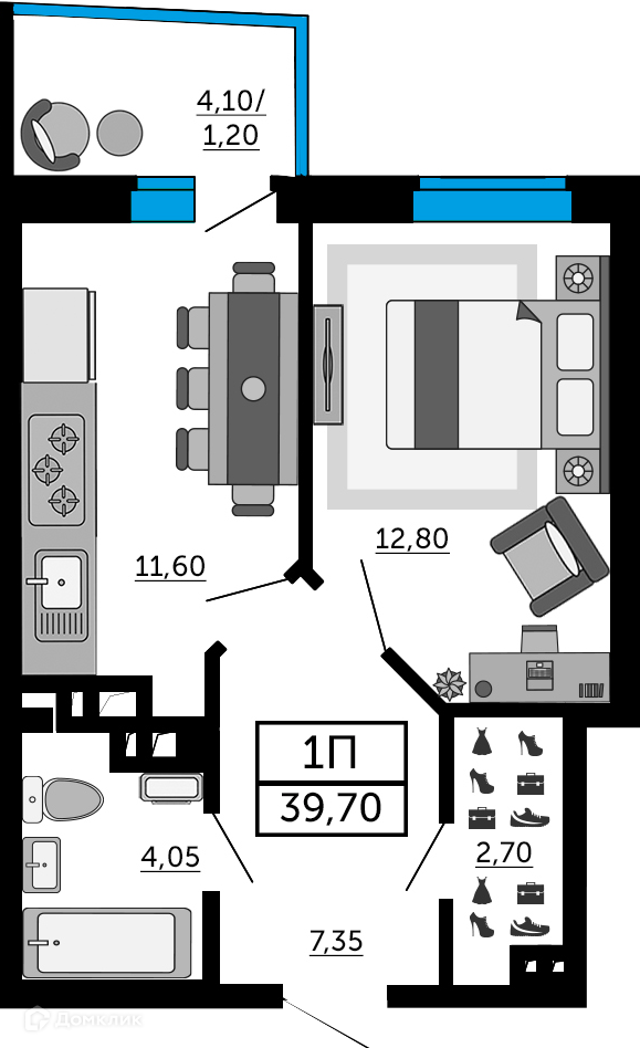 - Общая площадь: 39.7 м²