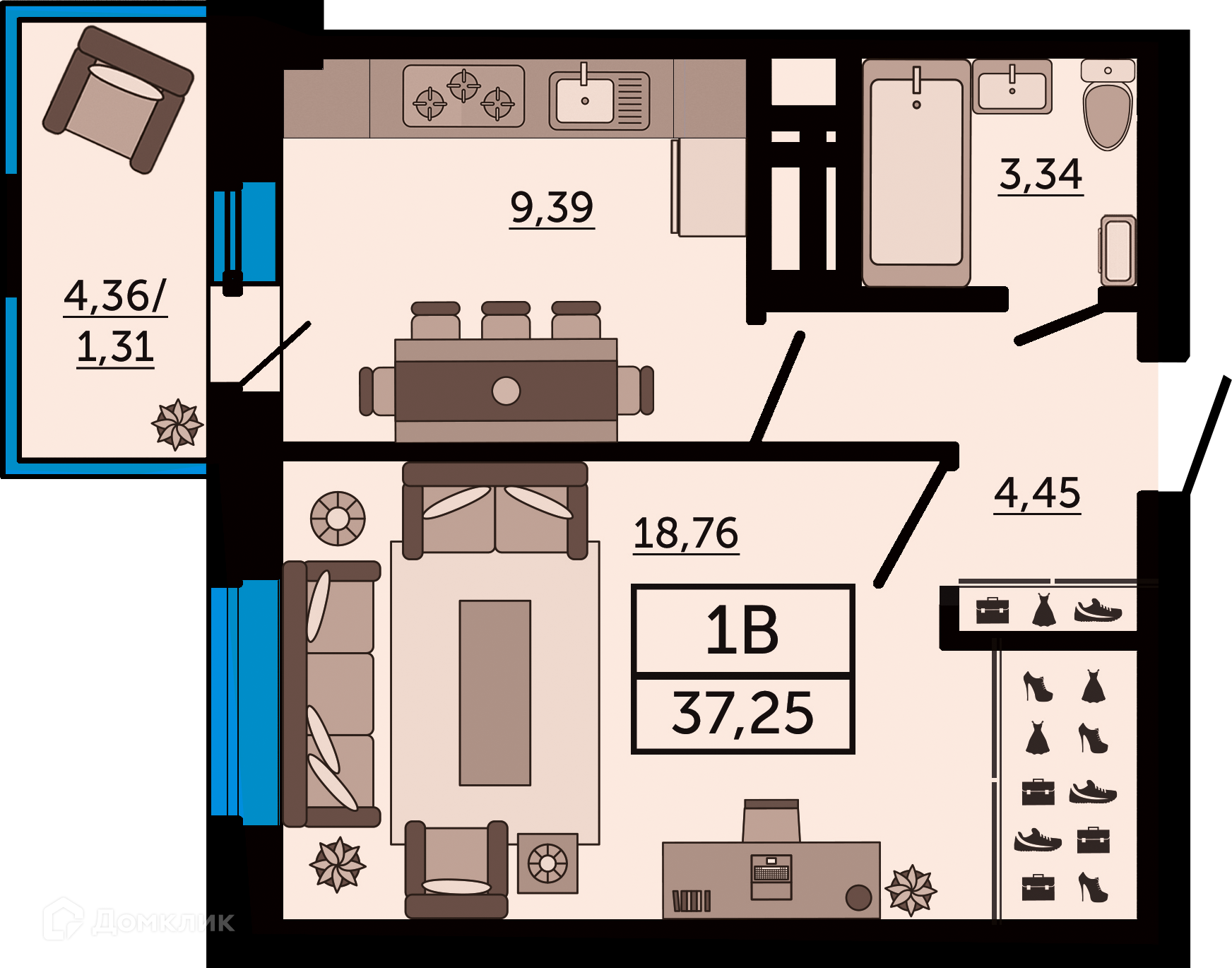 - Общая площадь: 37.25 м²