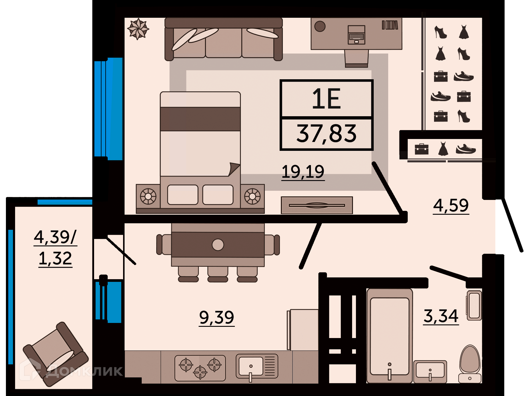 - Общая площадь: 37.83 м²