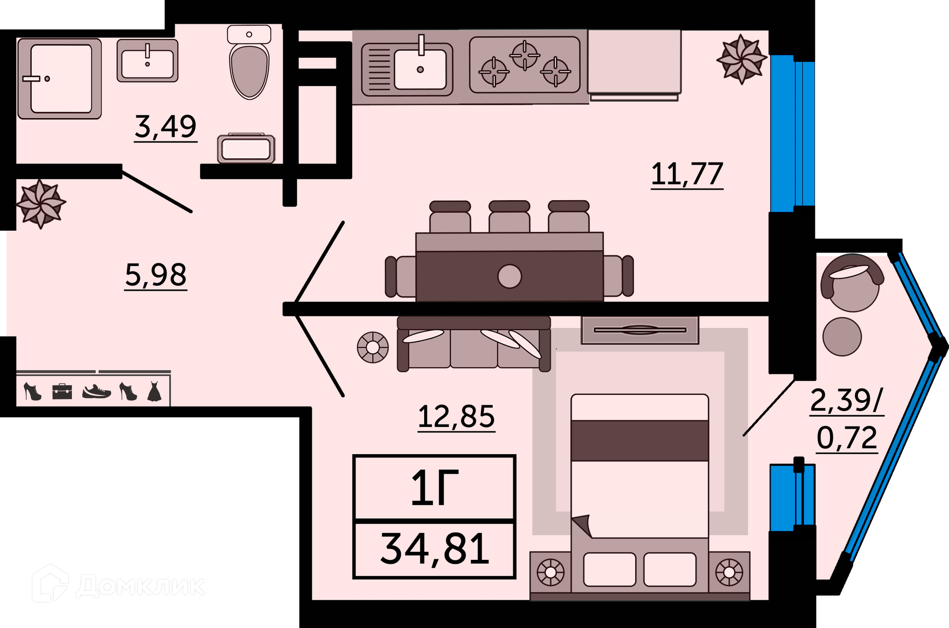 - Общая площадь: 34.81 м²