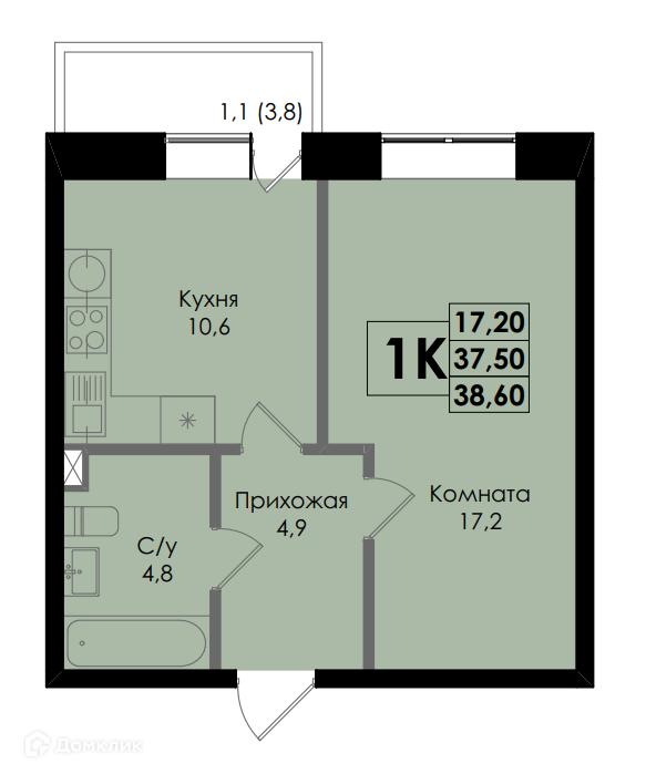 - Общая площадь: 38.6 м²