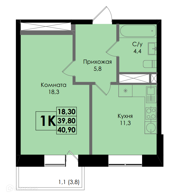 - ✅ Кухня: 11.3 м² — эргономичное пространство.
