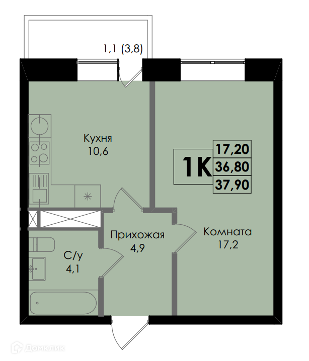 - Общая площадь: 37.9 м²