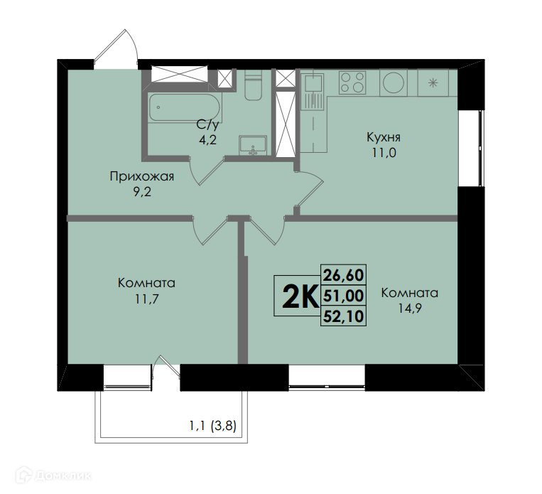 - Общая площадь: 52.1 м²