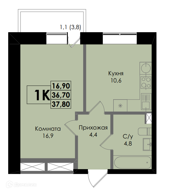 - ✅ Просторная жилая площадь: 16.9 м².