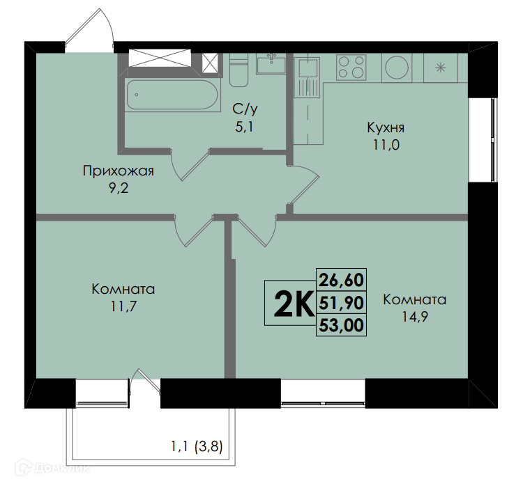 - ✅ Кухня: 11 м² — эргономичное пространство.