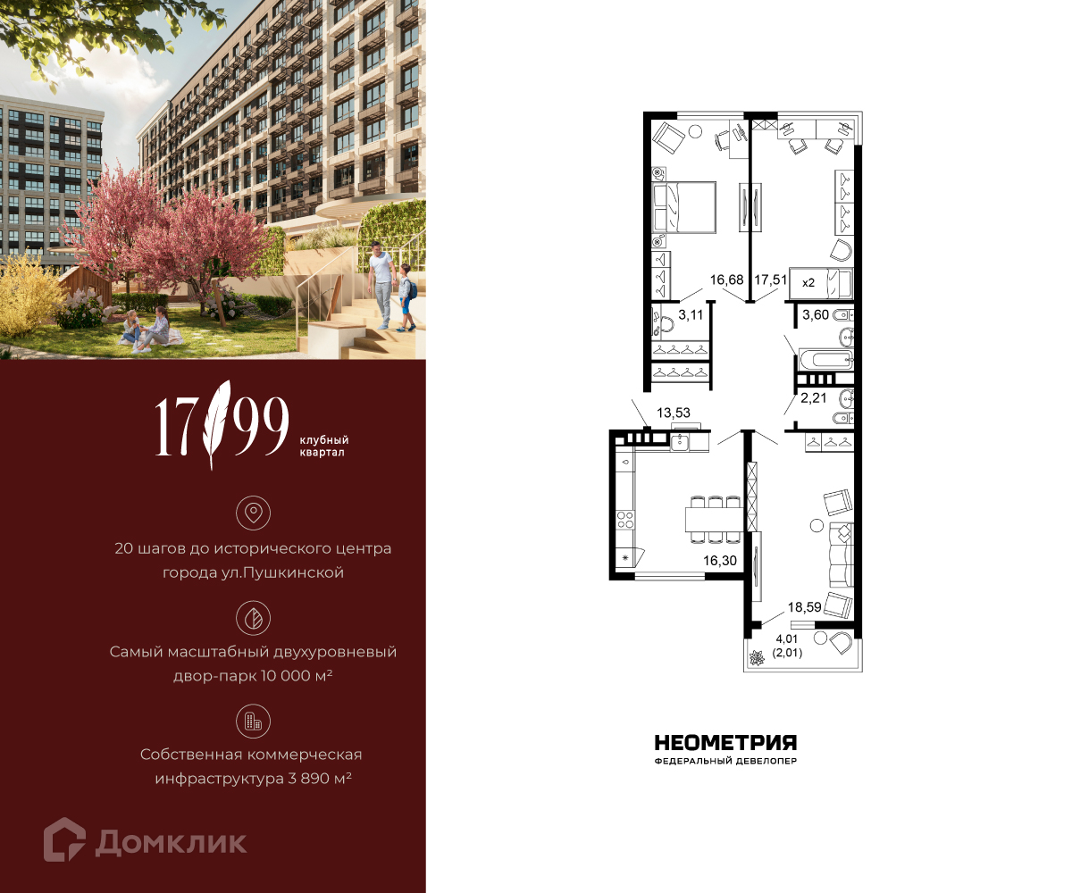 Предлагается 3-комнатная квартира в новом жилом комплексе "ЖК 1799" 🏢.