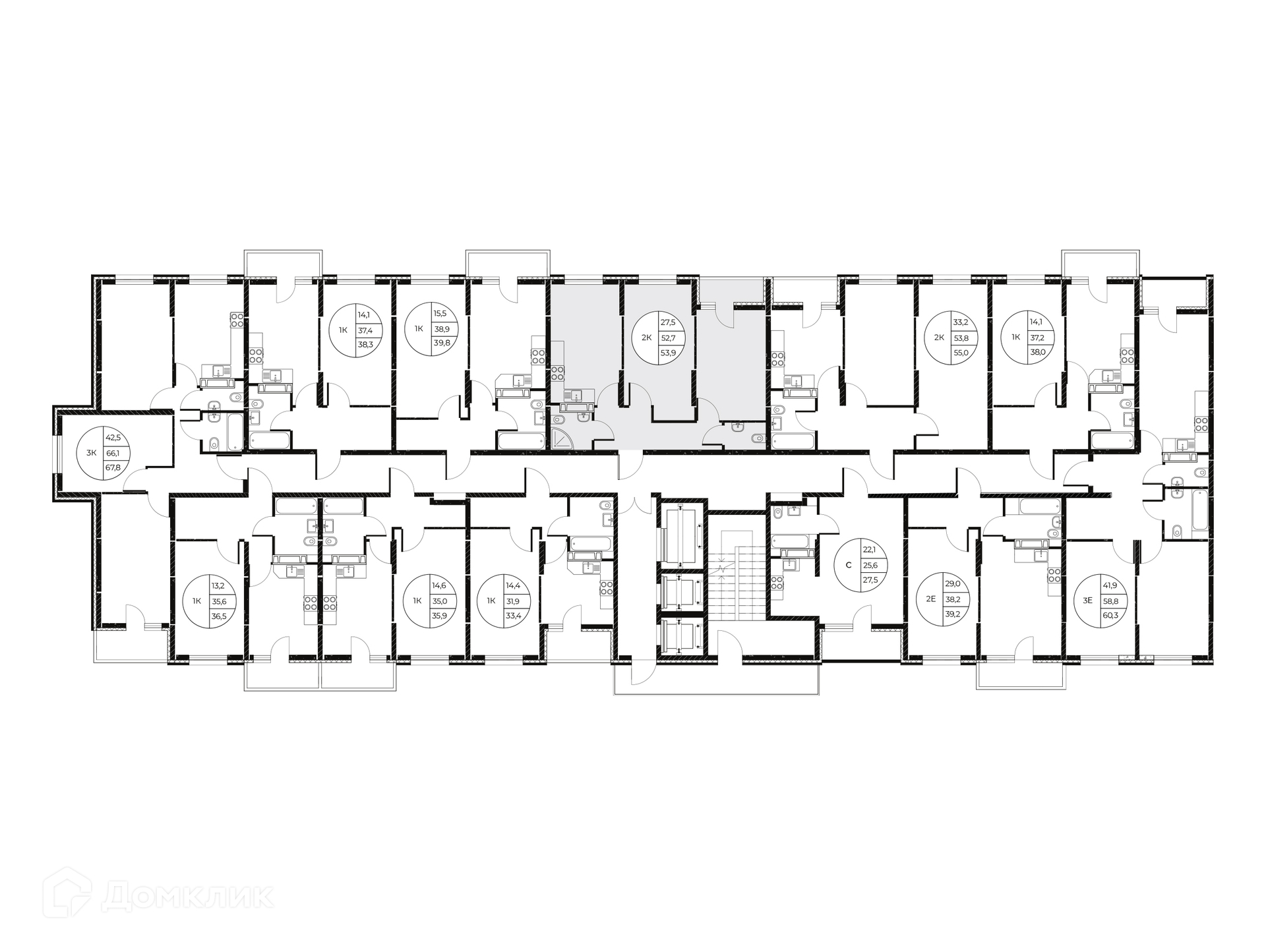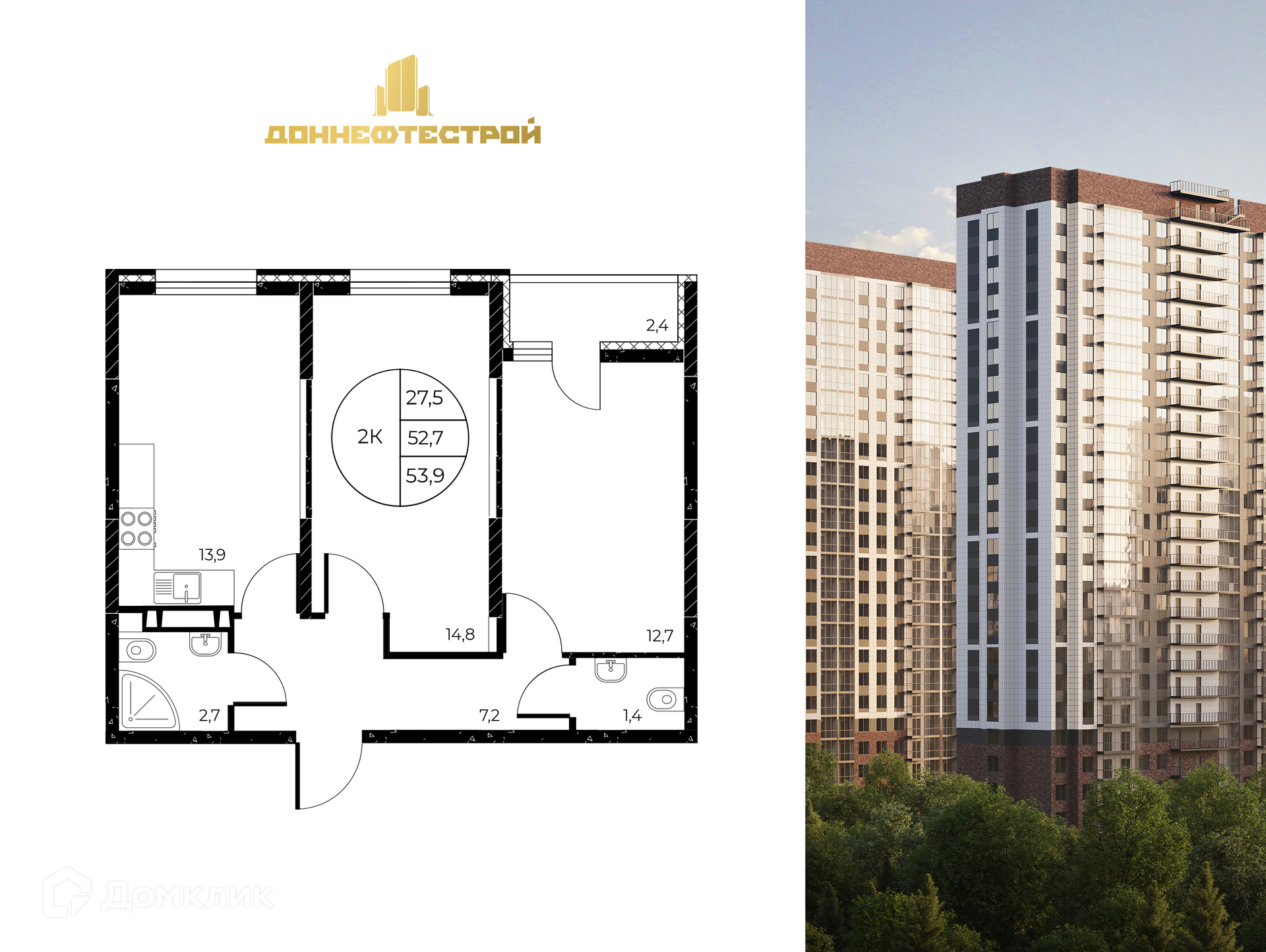 - Общая площадь: 53.9 м²