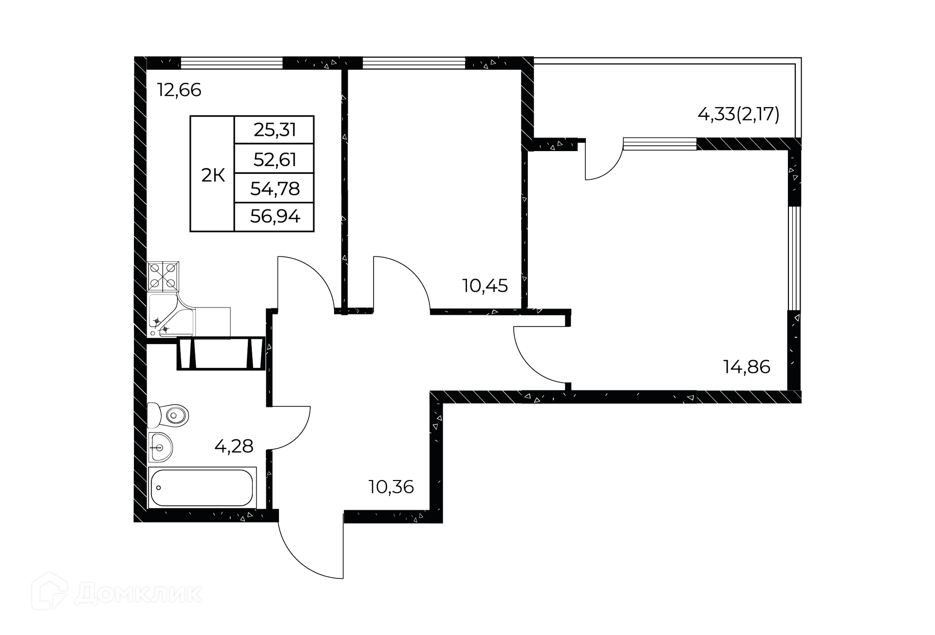 - Общая площадь: 56.94 м²