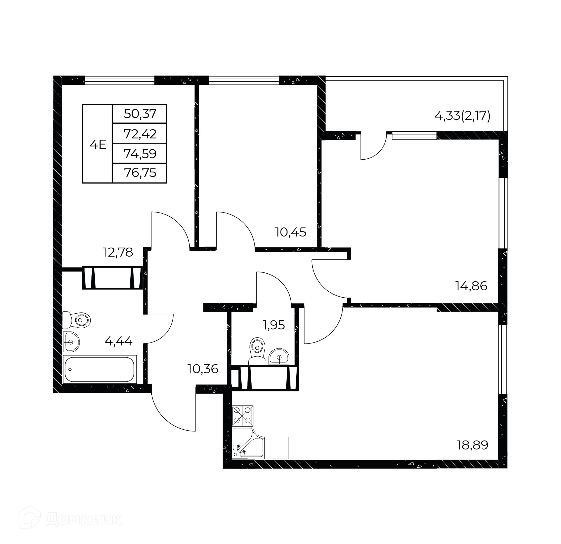 - Общая площадь: 76.75 м²