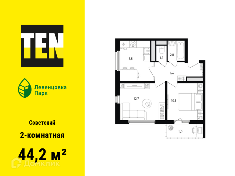 - Общая площадь: 44.2 м²