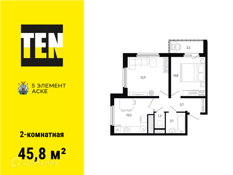 - Общая площадь: 45.8 м²
