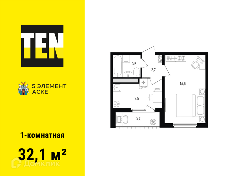 - ✅ Кухня: 7.5 м² — эргономичное пространство.