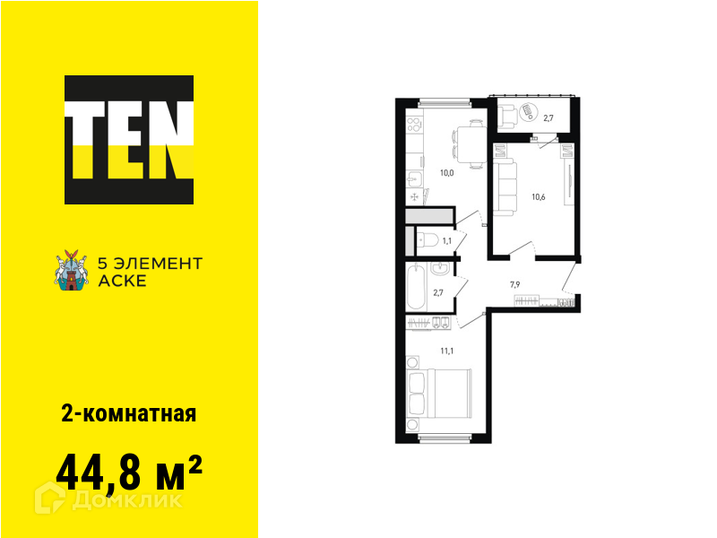 - Общая площадь: 44.8 м²