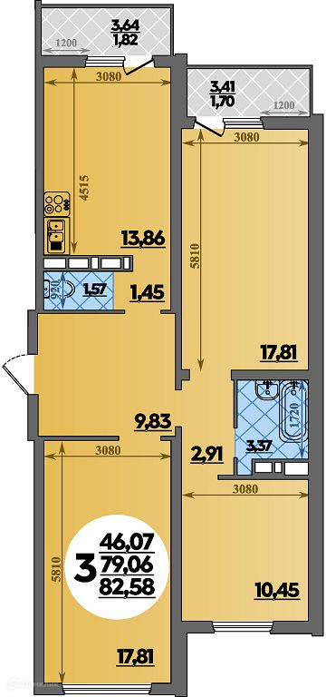 - ✅ Кухня: 13.86 м² — место для кулинарных шедевров.