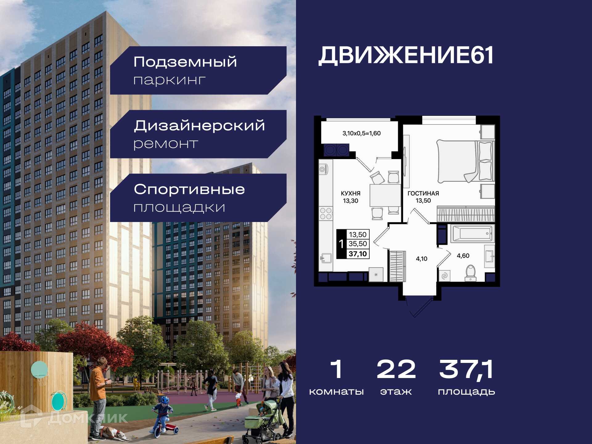 ЖК «Движение61» – проект в «Новом Ростове», на месте Старого аэропорта. Расположение, уникальное для города: одинаково близко и удобно добраться как до центра города, так и на выезд из Ростова, в сторону Черного моря. Территория комплекса объединяет новые технологии и близость к природе. Днем здесь царит спокойствие: можно посидеть на лавочке или отдохнуть на качелях в окружении цветущей лаванды и рябины. Но когда наступает вечер, «Движение61» буквально оживает: включаются фонари, загорается яркая подсветка. Интерактивные экраны и световые инсталляции создают настоящий вау-эффект. Бульвар из тихого уголка превращается в центр жизни квартала. Дворы комплекса закрыты для машин. Это идеальное место для отдыха на свежем воздухе или тренировки в современной спортивной зоне прямо под окнами. А для детей есть безопасные и яркие игровые площадки, от которых они будут в восторге. Актуальность и наличие уточняйте в отделе продаж!