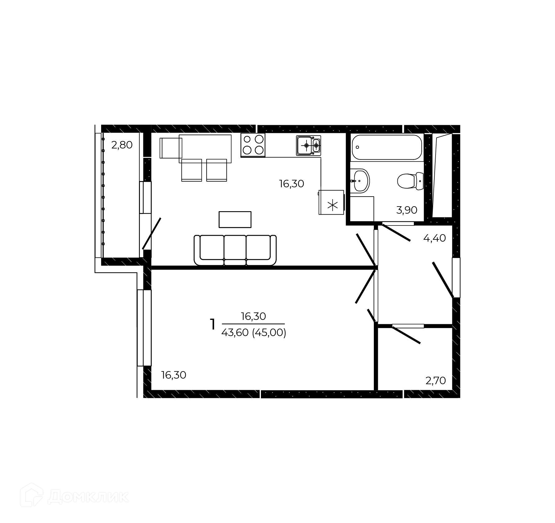 - Общая площадь: 45 м²
