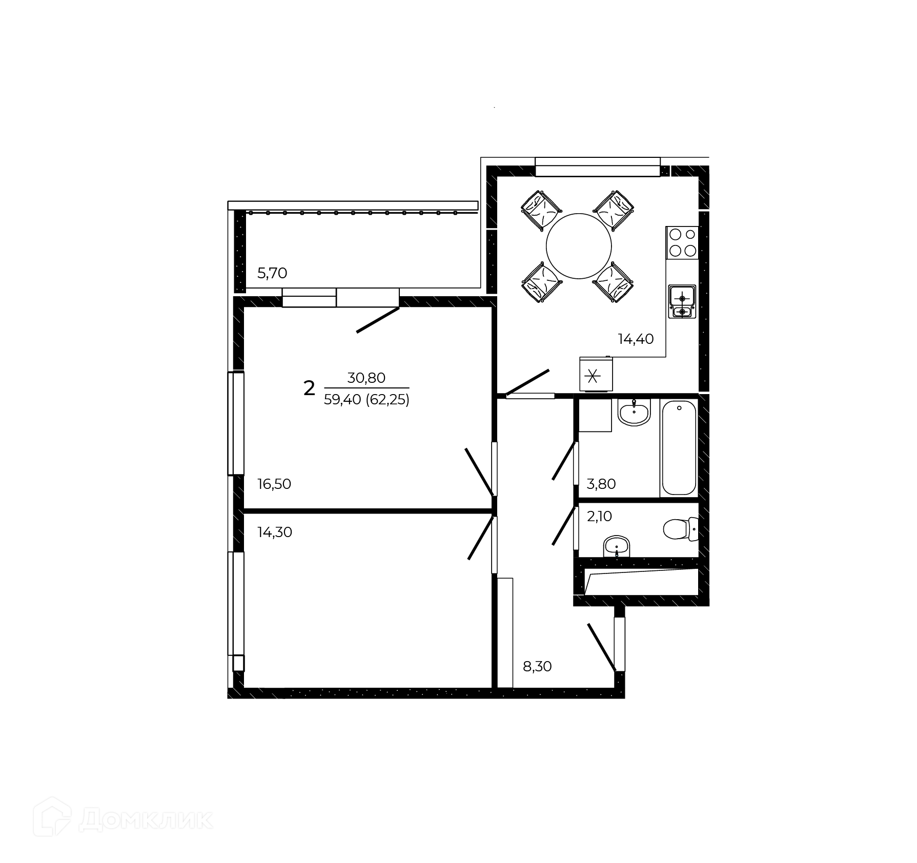 - Общая площадь: 62.25 м²
