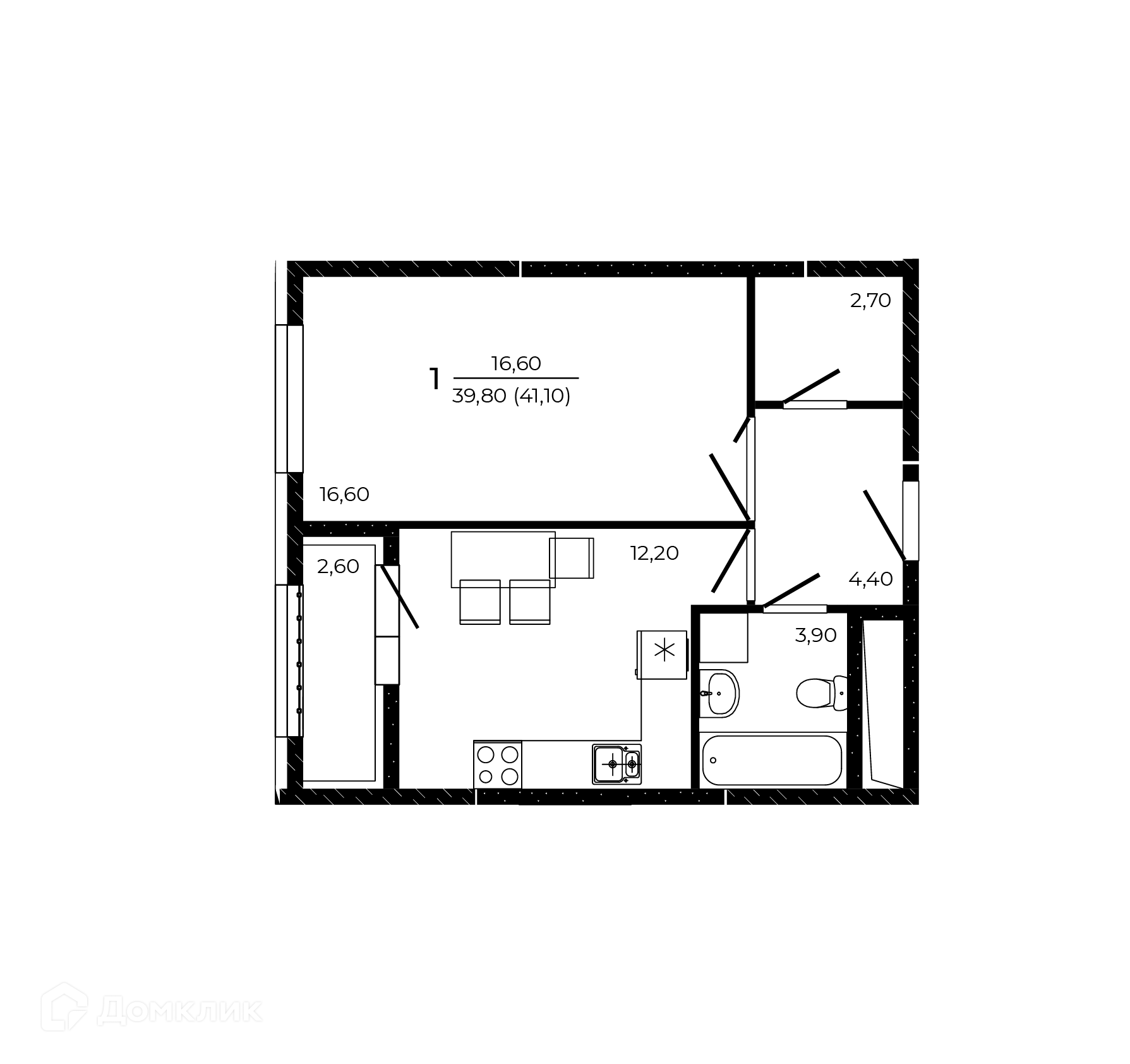 - Общая площадь: 41.1 м²