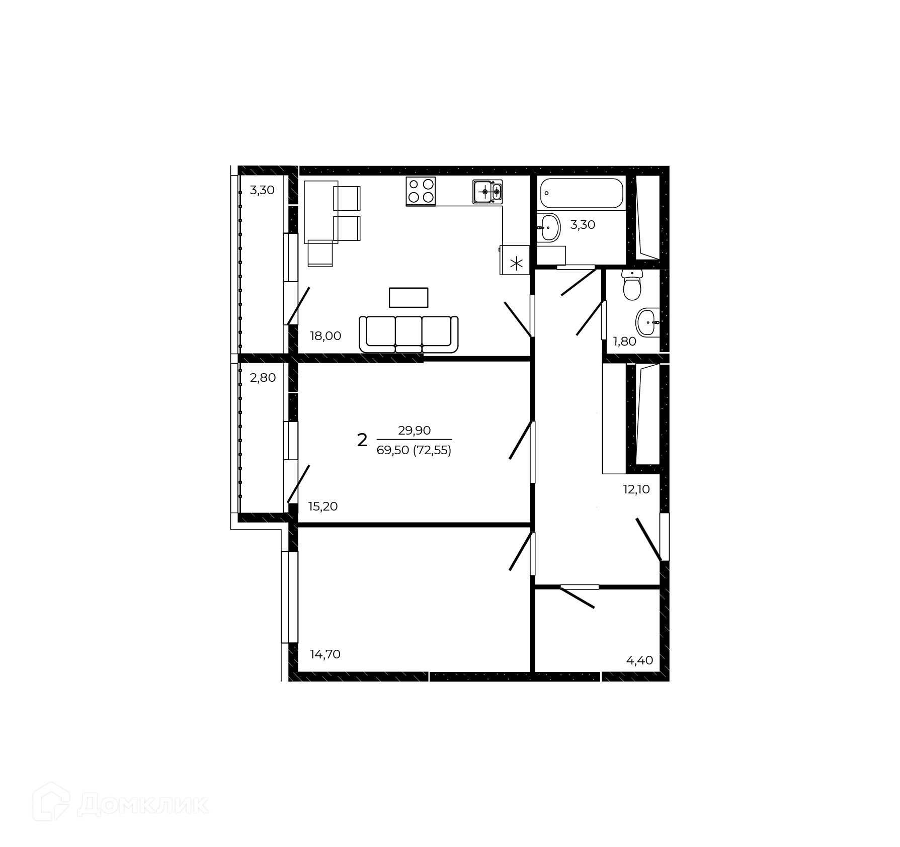 - Общая площадь: 72.55 м²