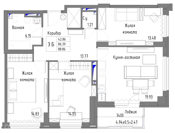 3 комн. квартира в Ростове-на-Дону в ипотеку от 113 055 руб/месяц