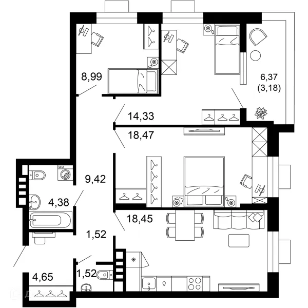 3 комн. квартира в Ростове-на-Дону в ипотеку от 113 509 руб/месяц