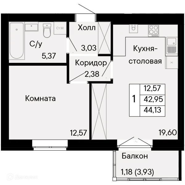 1 комн. квартира в Ростове-на-Дону в ипотеку от 49 555 руб/месяц