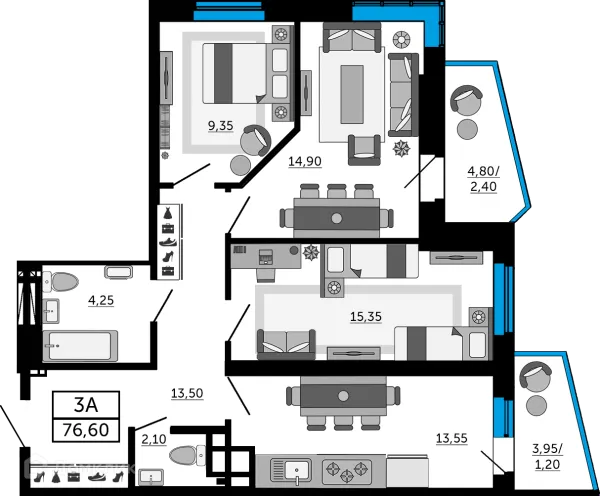 3 комн. квартира в Ростове-на-Дону в ипотеку от 75 800 руб/месяц