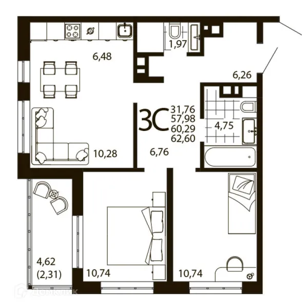 3 комн. квартира в Ростове-на-Дону в ипотеку от 63 458 руб/месяц