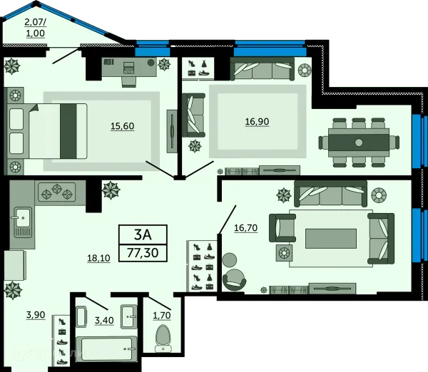 3 комн. квартира в Ростове-на-Дону в ипотеку от 74 203 руб/месяц