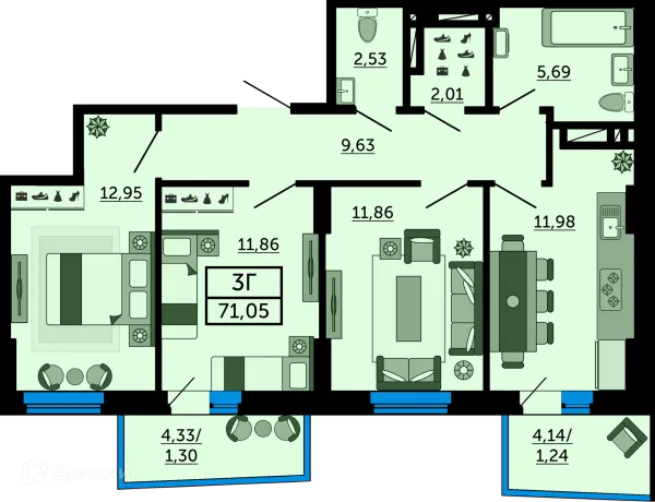 3 комн. квартира в Ростове-на-Дону в ипотеку от 67 055 руб/месяц