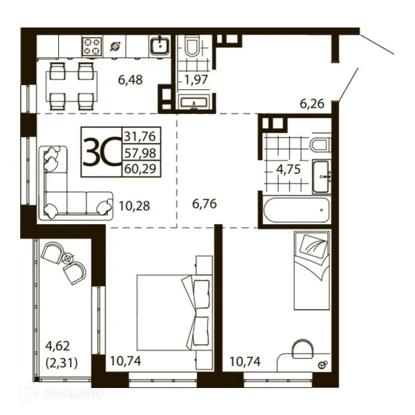 3 комн. квартира в Ростове-на-Дону в ипотеку от 59 681 руб/месяц