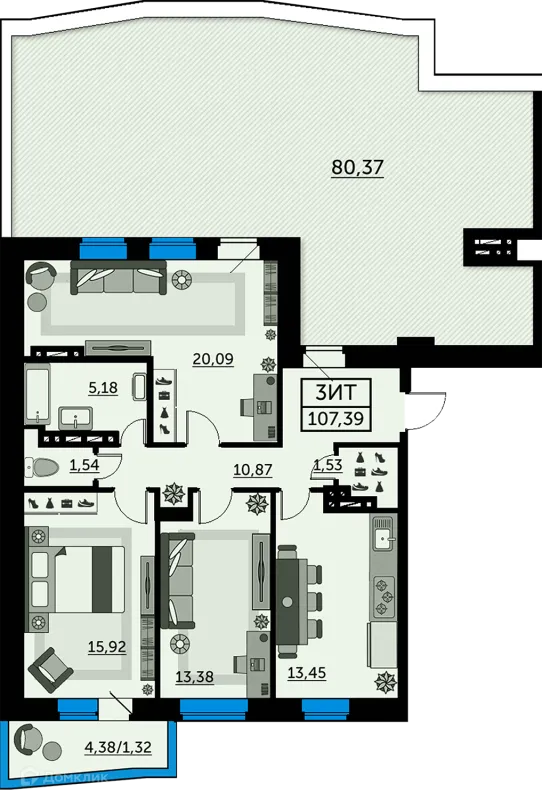 3 комн. квартира в Ростове-на-Дону в ипотеку от 80 615 руб/месяц
