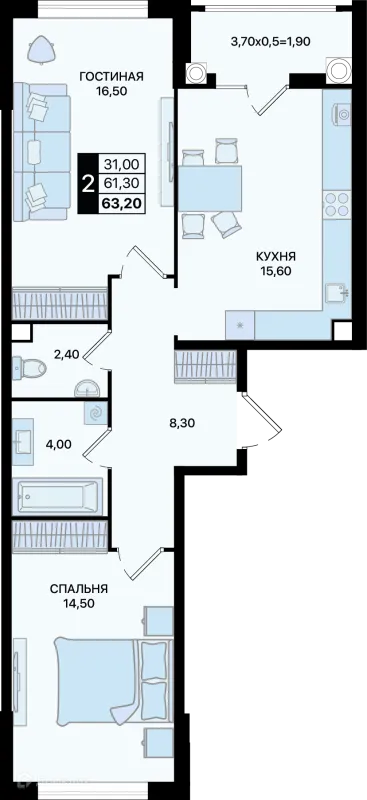 2 комн. квартира в Ростове-на-Дону в ипотеку от 54 521 руб/месяц