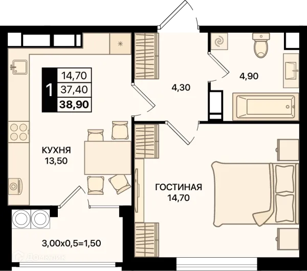1 комн. квартира в Ростове-на-Дону в ипотеку от 38 600 руб/месяц
